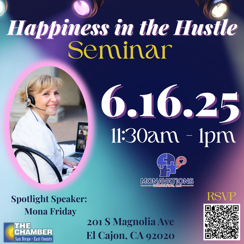 Join us for an inspiring and empowering seminar, Happiness in the Hustle, hosted at The Chamber presented by Monavations Consulting. This transformative midday session will feature spotlight speaker Mona Friday, founder of Monavations Consulting, as she guides attendees through the tools and mindset shifts necessary to achieve balance, fulfillment, and inner peace in the midst of a fast-paced professional world.